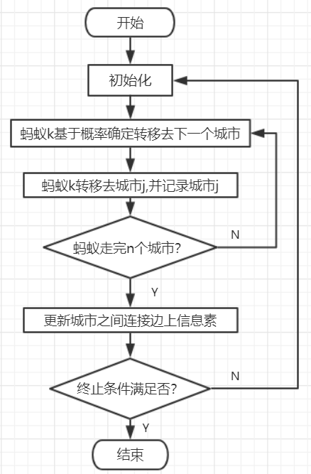运用人工蚁群算法求解TSP问题时的基本原理是:将m个蚂蚁随机地放在多个城市,让这些蚂蚁从所在的城市出发,n步(一个蚂蚁从一个城市到另外一个城市为1步)之后返回到出发的城市。如果m个蚂蚁所走出的m条路经对应的中最短者不是TSP问题的最短路程,则重复这一过程,直至寻找到满意的TSP问题的最短路径为止。为了说明这一个算法下面用一个算法流程图来表示一下: