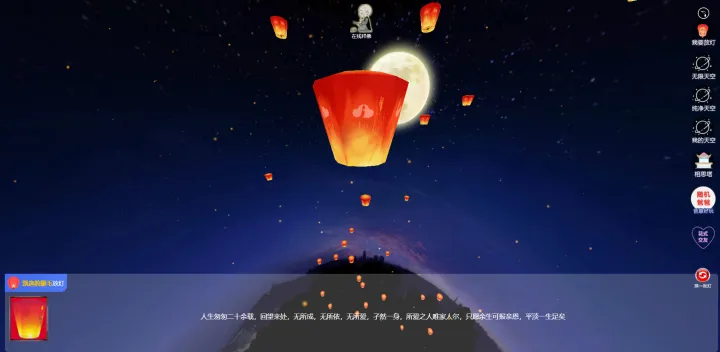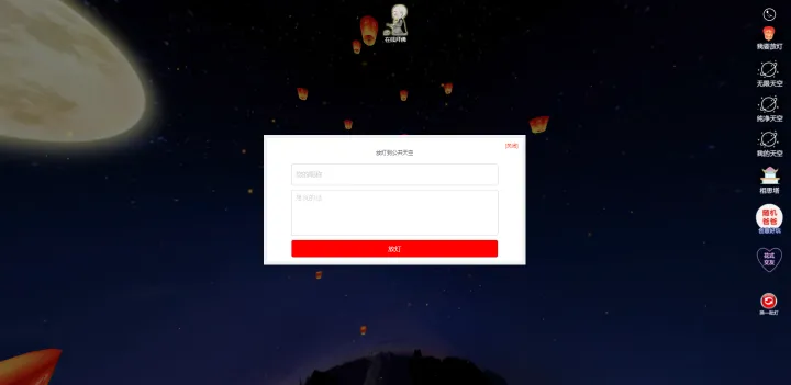 一个在线放孔明灯的网站,点击我要放灯,就可以留下昵称和心愿,编辑好之后点击放灯就可以了,没有条件放孔明灯的话,在这个网站放一个也不错。