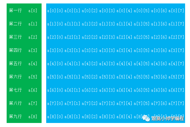 数组的元素可以为数字、字符串、对象,还可以是数组,元素为数组的数组称为多维数组,下面是一个二维数组(可以把它想像成一个9行8列的表格)