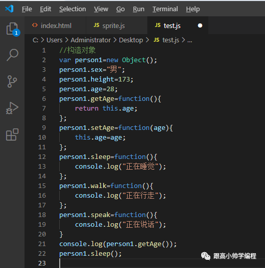 对象可以存储复杂的数据,那么什么是对象呢?计算机程序设计教材上关于对象的定义比较抽象,用我自己的话来说,就是将客观世界中的事物特征和行为用计算机语言来描述并保存至一个变量中,这个变量就叫对象。以人为例,每个人的特征都不一样(性别、身高、体重……),但都有相同的行为(说话、行走、睡觉……)。常用的对象定义方式有两种:构造对象和直接定义对象,先看看构造对象的方法
