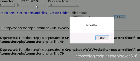 4.【Connector】选择PHP,然后直接上传PHP文件会出现提示,表示不能上传PHP类型的文件,很有可能存在文件后缀黑名单。