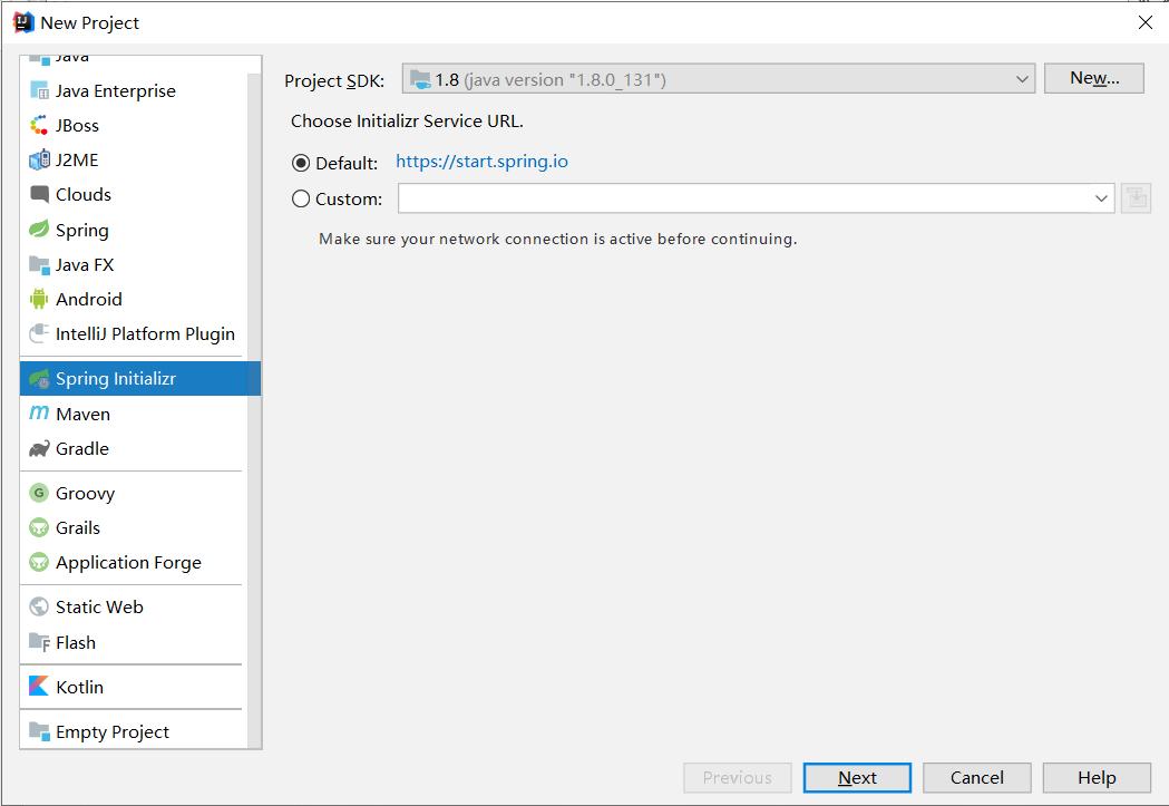 - 选中 Spring Initializr ,这时可以看到右侧让我们选择一个初始化的服务 url,默认的就是上面的官方链接,https://start.spring.io/