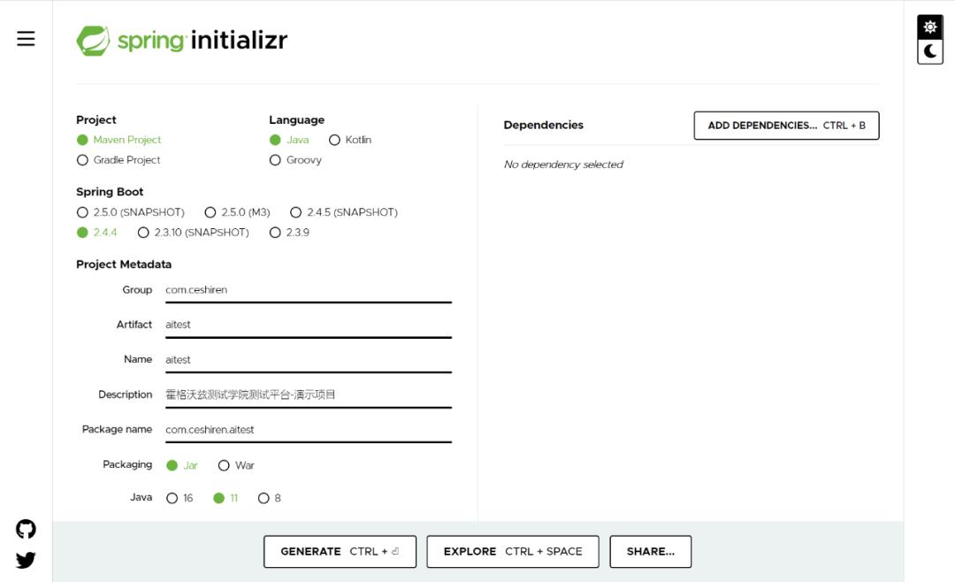 - 打开 https://start.spring.io/,可以看到以下信息(可根据需要调整):