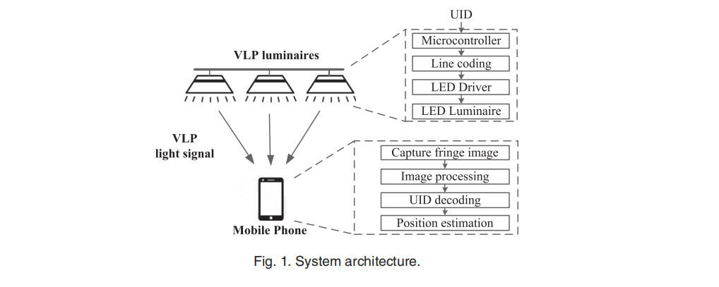 《High-Speed Indoor Navigation System based on Visible Light and Mobile Phone》文章提出了一种新的VLP(可见光定位)解决方案,通过设计一个复杂的无闪烁线编码方案和一个轻量级的图像处理算法,提供精确和高速的室内导航。