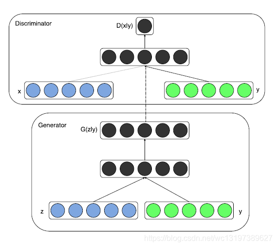 就是在GAN的目标函数上添加了y这一类别变量,x变为了条件分布。