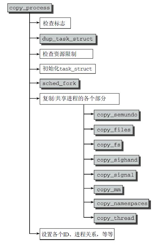 do_fork主要的一部分工作集中在copy_process中,线程与进程之间的区别也是在该接口中体现,接口的代码流程图如下所示: