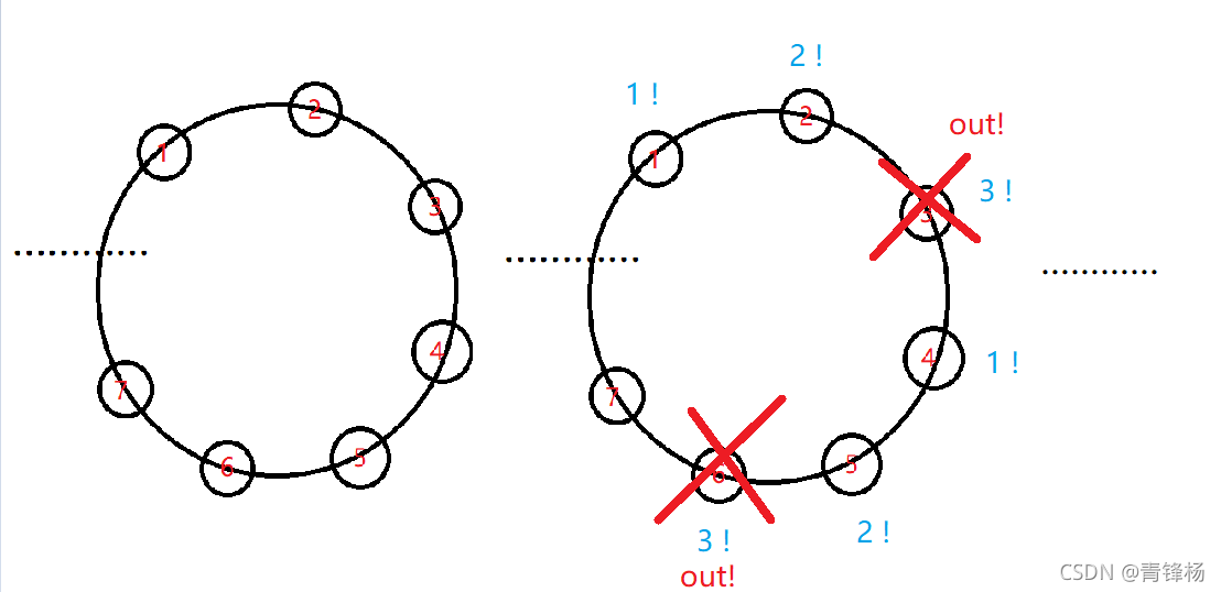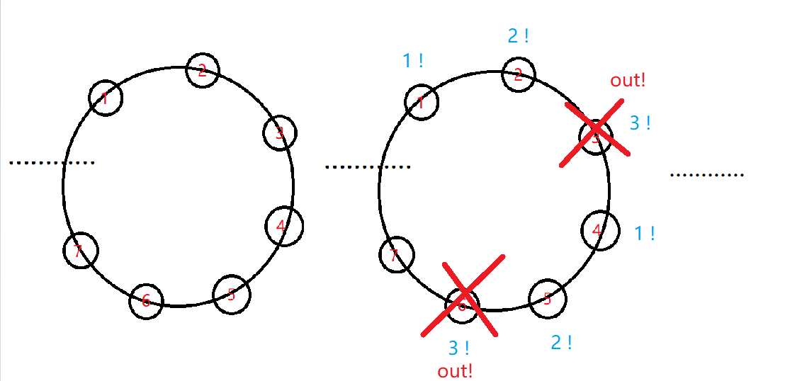 int out = 0; //游戏淘汰人数for (int i = 1; i <= n; i++) //为每一位游戏成员挂上编号circle[i - 1] = i;