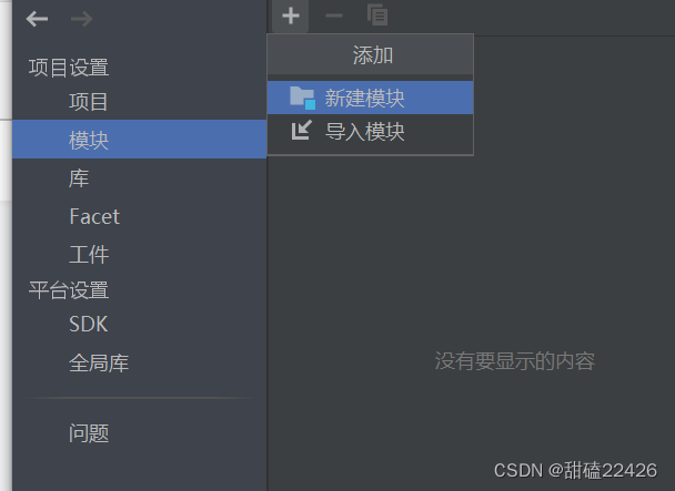 接着我们换到模块那里去,点击上边的加号,选择新建模块