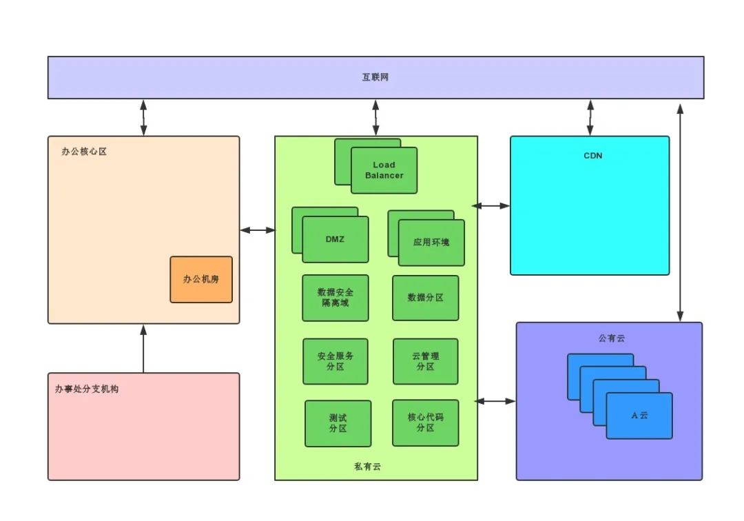 · 如果使用公有云基础服务,呈现混合云的模式,这些基础服务与核心数据中心存在互连。
