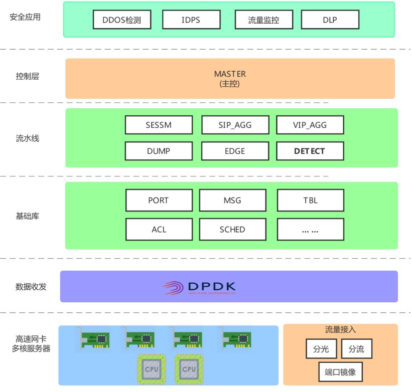 · 高性能: 基于DPDK(https://www.dpdk.org/)利用普通x86服务器即可高速处理10Gbps以上的流量,绕过了内核复杂的协议栈,并采用轮询的方式收发数据包,基于主从和流水线架构,无锁化设计。