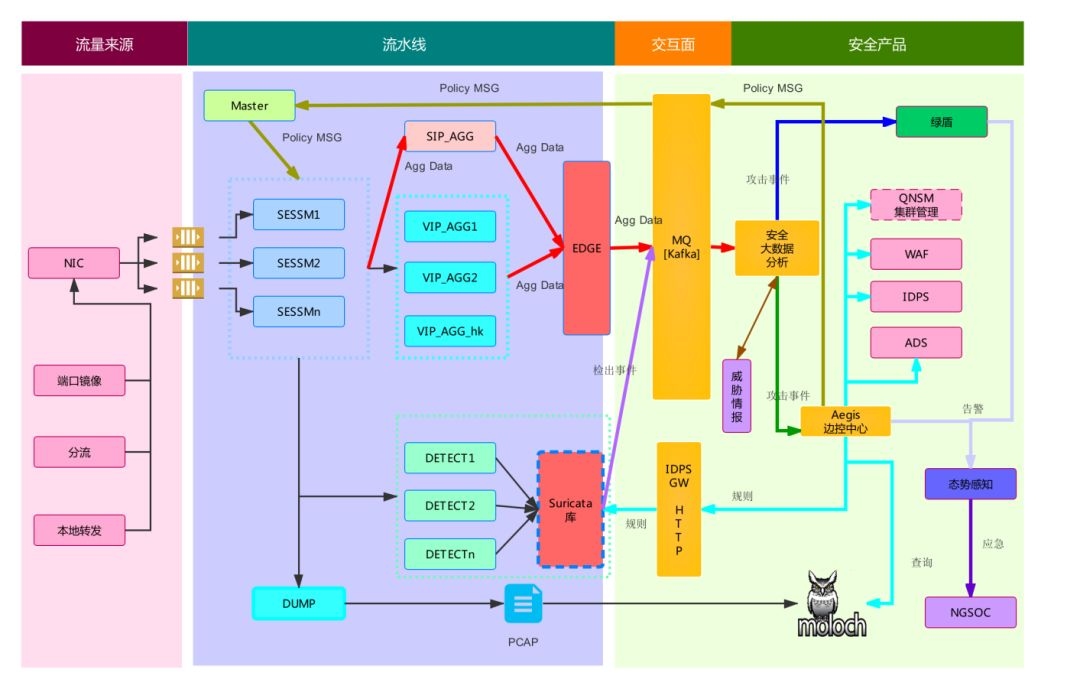 · 边控中心可以按事件驱动QNSM dump网络流量成PCAP文件,并ETL进Moloch ( https://github.com/aol/moloch a largescale, open source, indexed packet capture and search system)建立包索引,方便对事件进行包级别的分析和溯源。