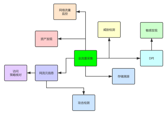 全流量分析是非常重要的, 可以用来进行资产发现、网络监控和可视化,对安全而言,通过对网络流量的分析,对流量构建基线建模,从流量中可以发现异常、风险以及检测攻击,从流量中也可以实现数据内容提取,发现潜在的敏感数据流动或者泄露,还可以进行ACL策略校对,并将网络流量产出的数据特征通过机器学习和专家分析,可以挖掘更多的信息以及进行取证溯源和事件回查。