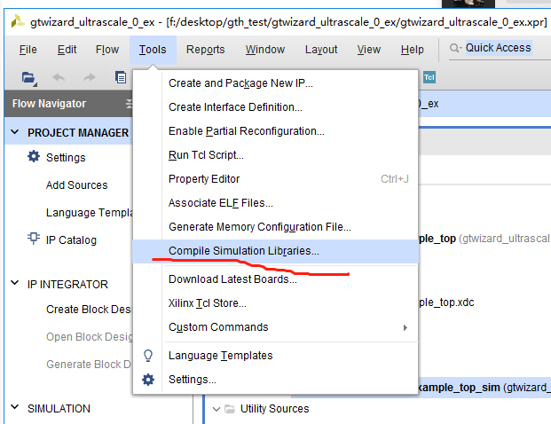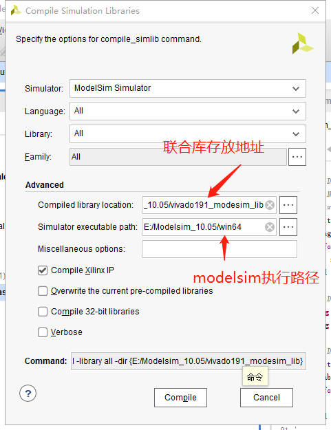 1 编译联合仿真库 tool → compile_simulation_libraries ,选择simulator 为 modelsim simulator,填写好 compiled library location(联合库存放地址),simulator executable path (modelsim.exe 地址)