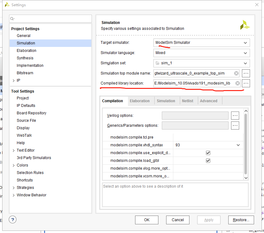 2 setting里面simulation选项,选择 target simulator 为 modelsim, 编译库设置为第1步的存放位置。