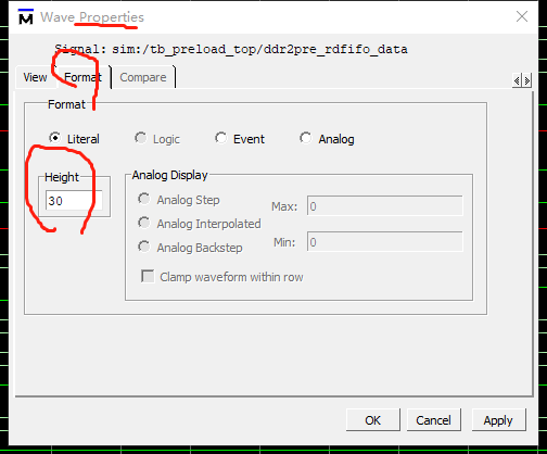 要执行这一命令,首先在上次把信号往波形窗口里面添加好后,单击一下波形窗口的信号,执行一下操作File----Save Format...命令,或者直接点击工具栏中左上角的保存