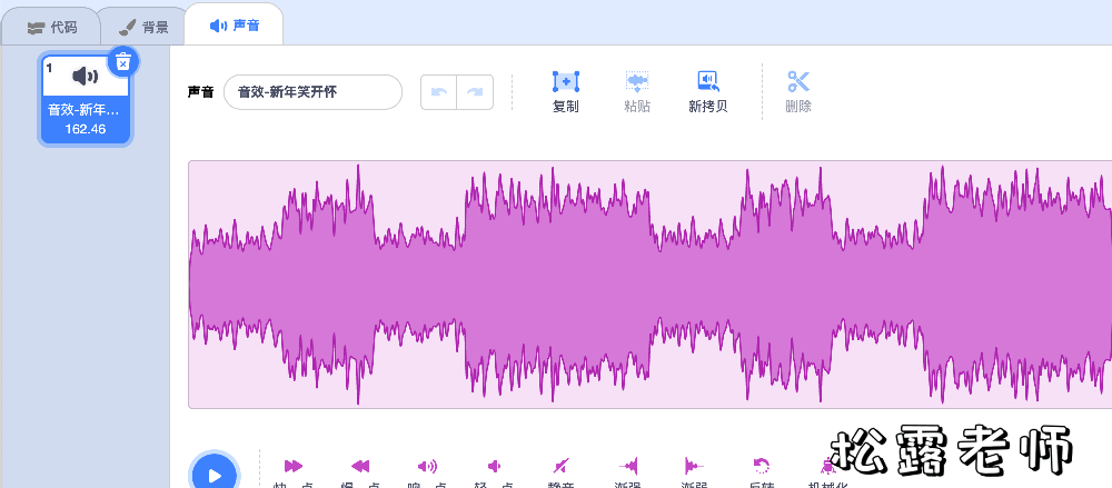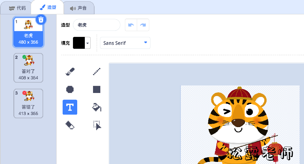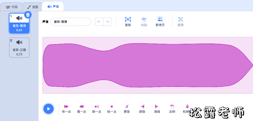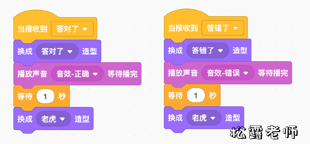 然后,给老虎角色增加两个音效,分别是答对了和答错了的音效。