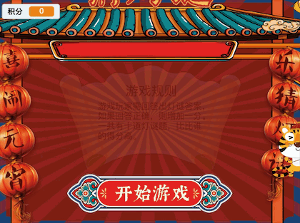 当游戏开始后,玩家需回答出灯谜答案,如果回答正确,则增加一分。一共有十道灯谜题,比比谁的得分高。