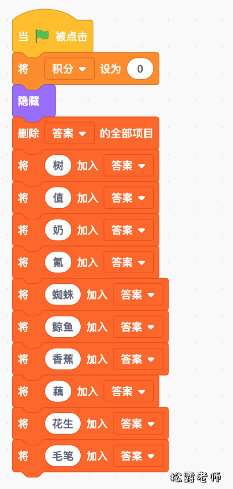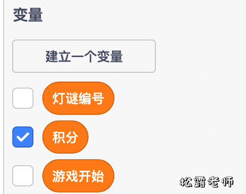 我们给游戏程序创建三个变量,一个是灯谜编号,一个是积分,一个是游戏开始。再创建一个答案列表,用来记录灯谜的答案。
