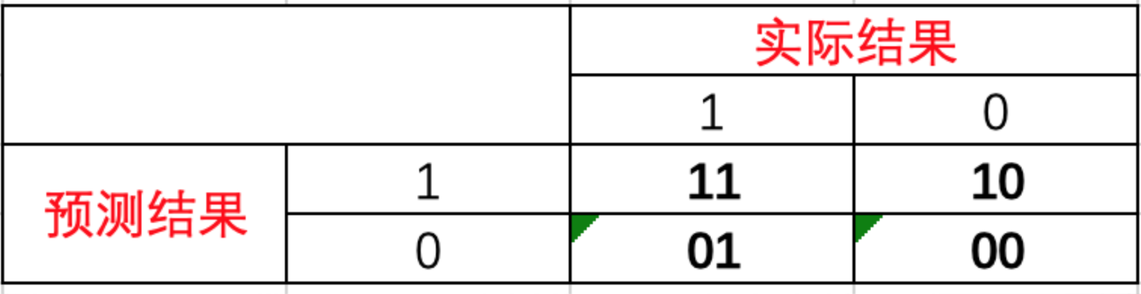 由于用数字1、0表示不太方便阅读,我们转换一下,用T(True)代表正确、F(False)代表错误、P(Positive)代表1、N(Negative)代表0。先看预测结果(P|N),然后再针对实际结果对比预测结果,给出判断结果(T|F)。按照上面逻辑,重新分配后为