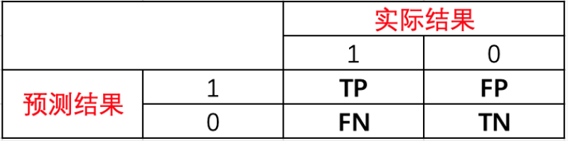 介绍各个指标之前,我们先来了解一下混淆矩阵。假如现在有一个二分类问题,那么预测结果和实际结果两两结合会出现如下四种情况。