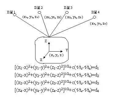 当GPS卫星正常工作时,会不断地用1和0二进制码元组成的伪随机码(简称伪码)发射导航电文。导航电文包括卫星星历、工作状况、时钟改正、电离层时延修正、大气折射修正等信息。然而,由于用户接受机使用的时钟与卫星星载时钟不可能总是同步,所以除了用户的三维坐标x、y、z外,还要引进一个变量 t 即卫星与接收机之间的时间差作为未知数,然后用4个方程将这4个未知数解出来。所以如果想知道接收机所处的位置,至少要能接收到4个卫星的信号。如下图所示: