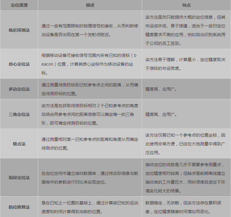 目前室内定位常用的定位方法,从原理上主要分为七种:邻近探测法、质心定位法、多边定位法、三角定位法、极点法、指纹定位法和航位推算法。