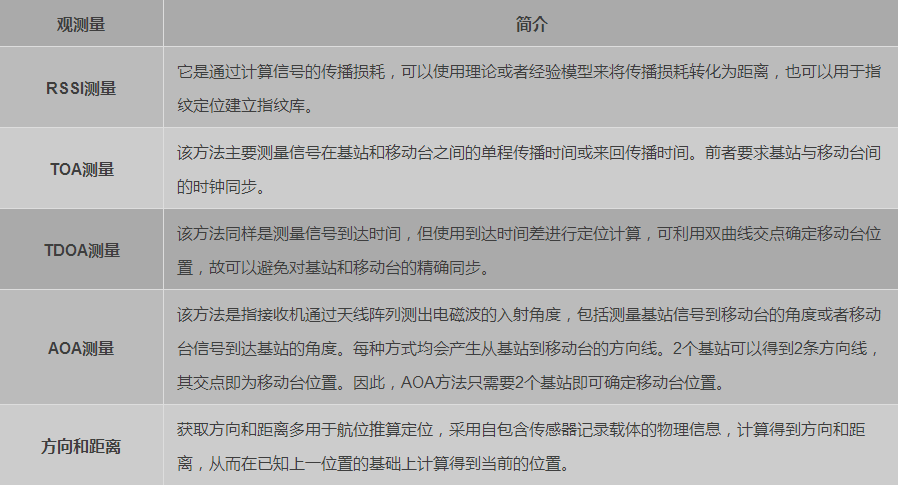 不同的室内定位方法选择不同的观测量,通过不同的观测量提取算法所需要的信息。下表对主要的观测量进行简要的介绍。