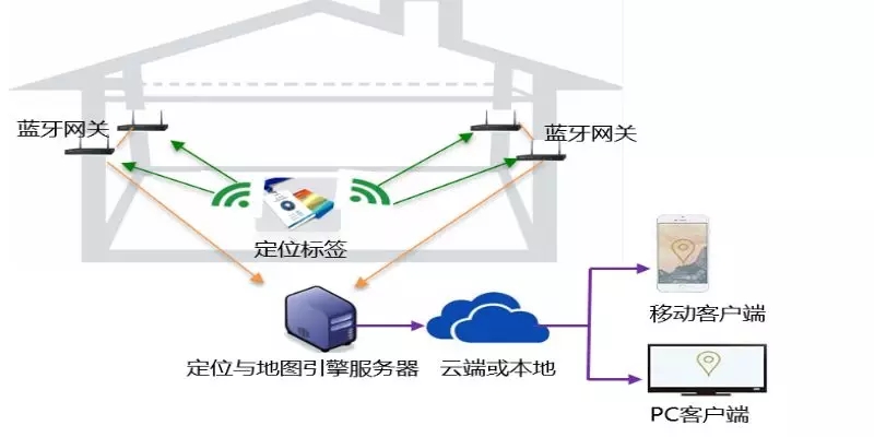 网络侧定位系统由终端(手机等带低功耗蓝牙的终端)、蓝牙beacon节点,蓝牙网关,无线局域网及后端数据服务器构成。其具体定位过程是: