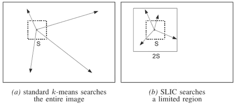1)通过将搜索空间限制为与超像素大小成比例的区域,显着地减少了优化中的距离计算的数量。这降低了像素数N的线性复杂度,并且与超像素k的数量无关。