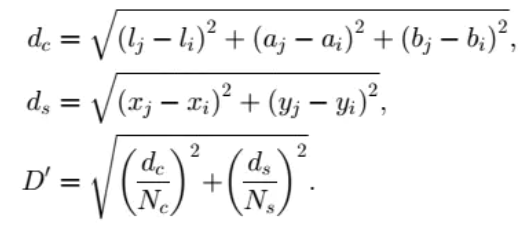 - 距离度量。包括颜色距离和空间距离。对于每个搜索到的像素点,分别计算它和该种子点的距离。距离计算方法如下: