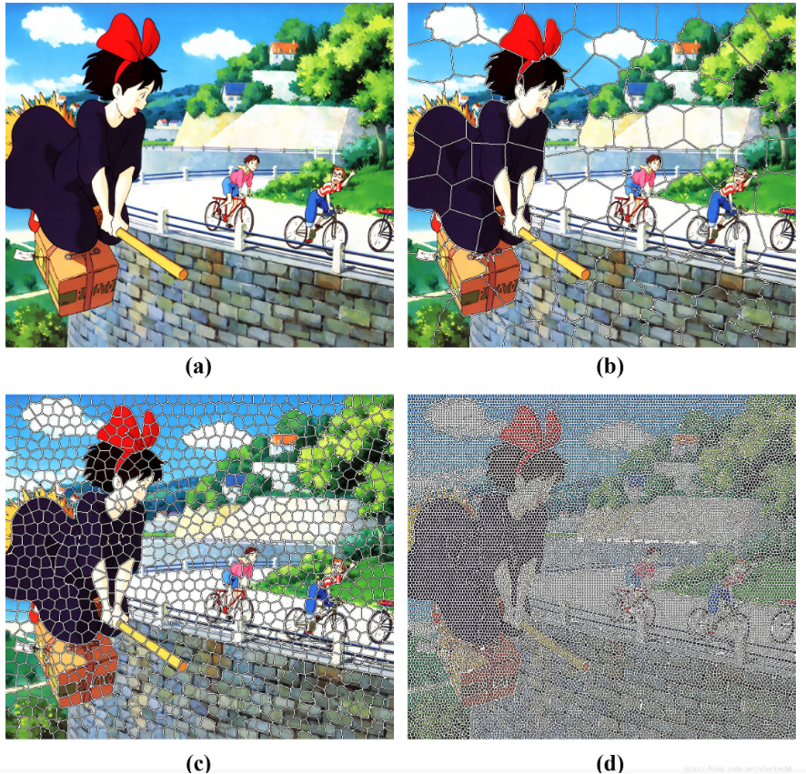 (a)原图,超像素尺寸:(b)100X100,(c)30X30,(d)8X8