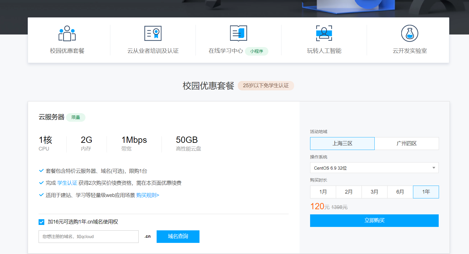 1.首先,百度,腾讯云,选择下面的学生云服务器优惠套餐10元/月,这里我附上直达链接