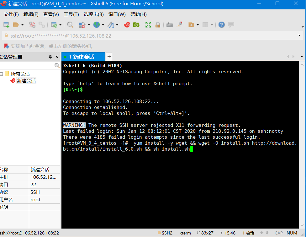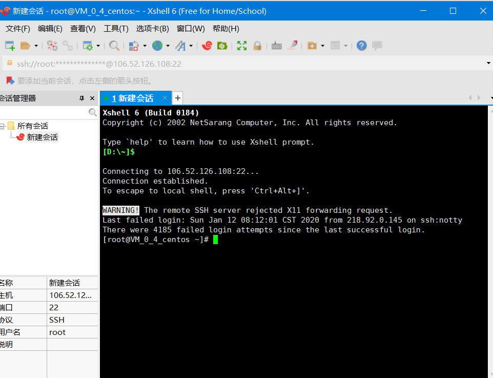 双击新建会话,会弹出ssh安全警告窗口,选择接受就好了,之后显示下面的内容就是链接成功了。