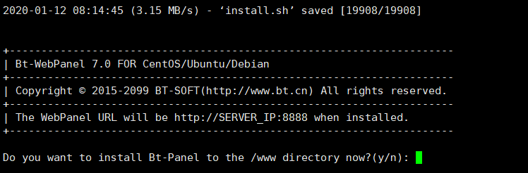 然后输入命令 yum install -y wget && wget -O install.sh http://download.bt.cn/install/install_6.0.sh && sh install.sh