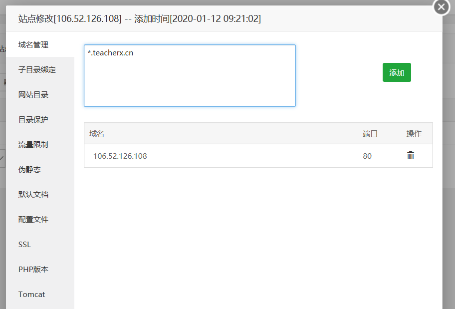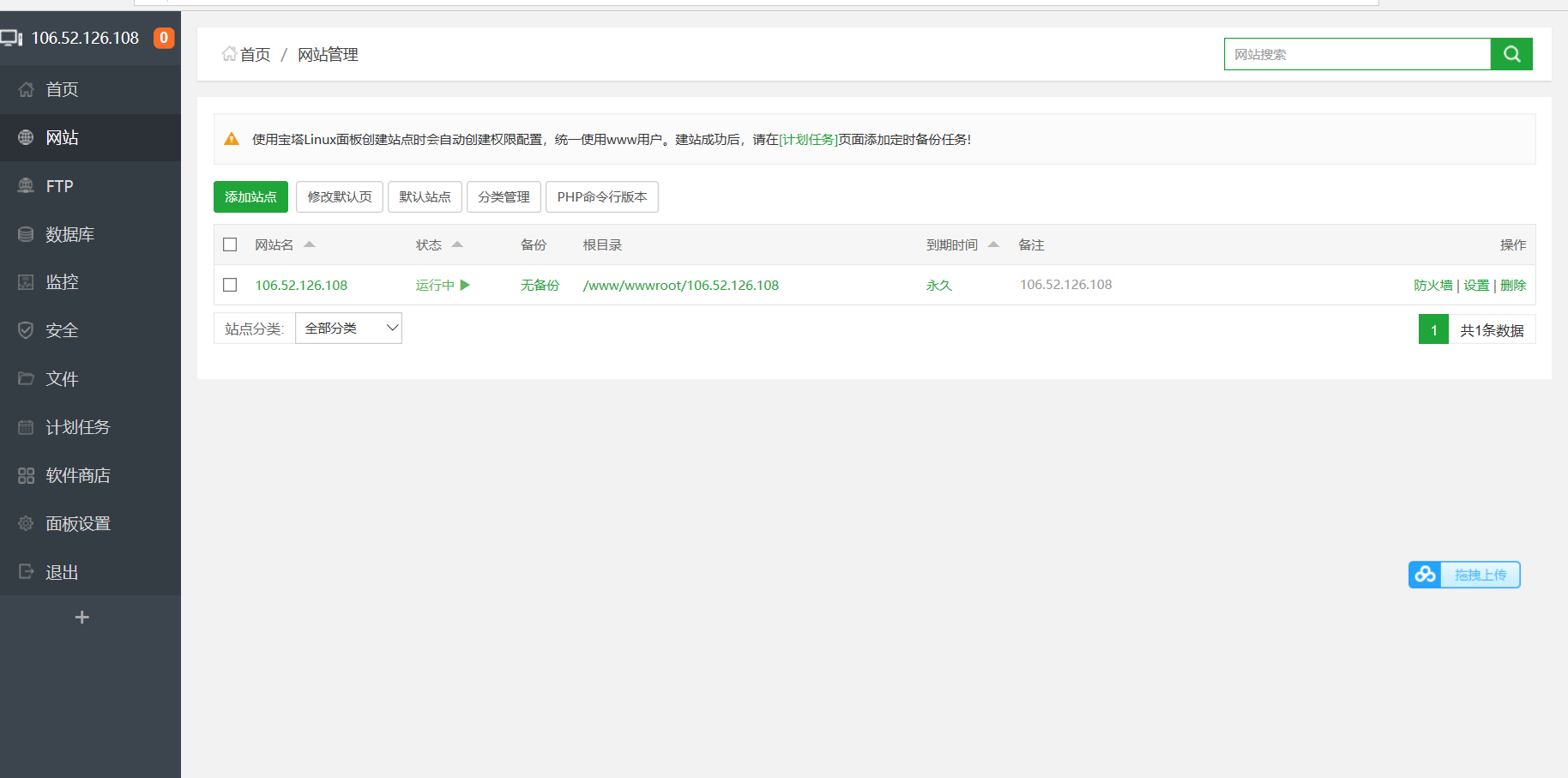 还有,如果你有一个域名,可以绑定一下。在宝塔界面,选择网站,设置,