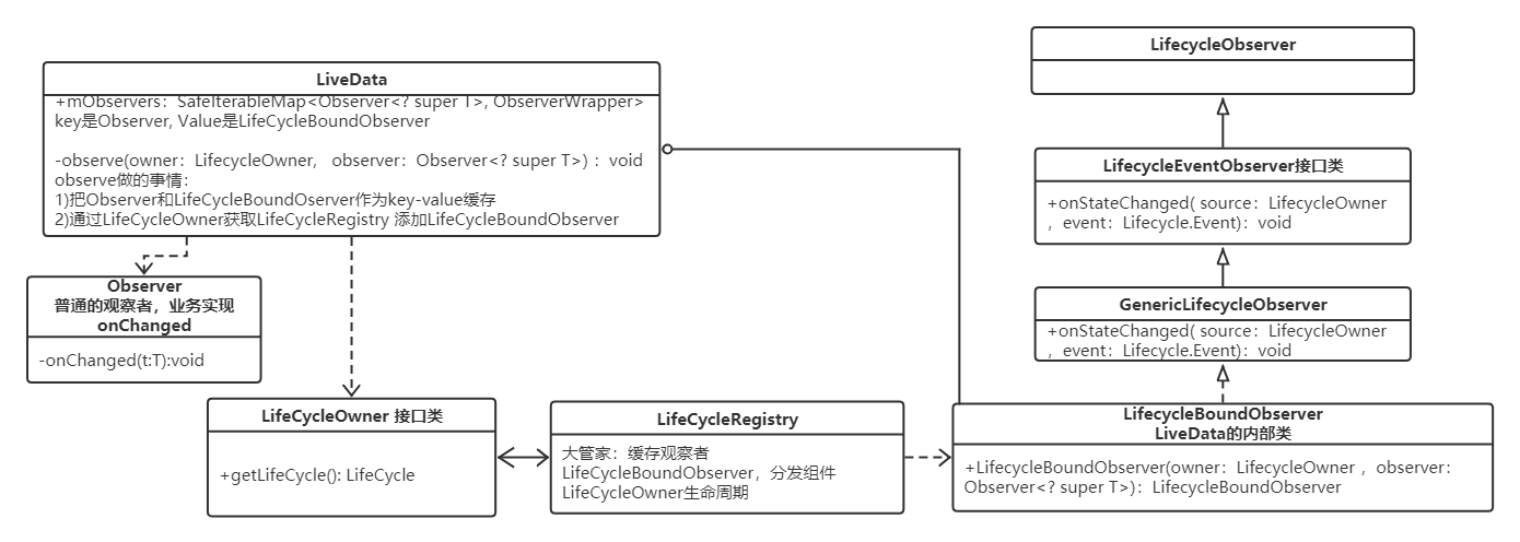 3)LifeCycleBoundObserver持有LifeCycleOwner(Activity、Fragment组件)和一个普通的接口类Observer(需要实现onChanged)。这个普通的接口Observer是业务实现,业务负责监听处理回调。当LifeCycleOwner(Activity、Fragment组件)生命周期发生改变时,LifeCycleObserver的onStateChanged调用(详情看LifeCycle原理)。