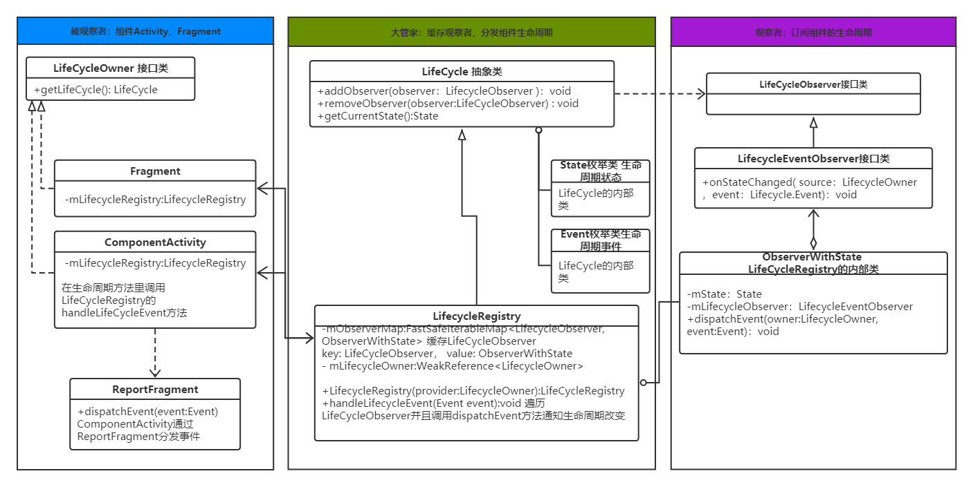 1)继承自LifeCycle的LifecycleRegistry,它与LifeCycleOwner(Activity,Fragment)相互持有。