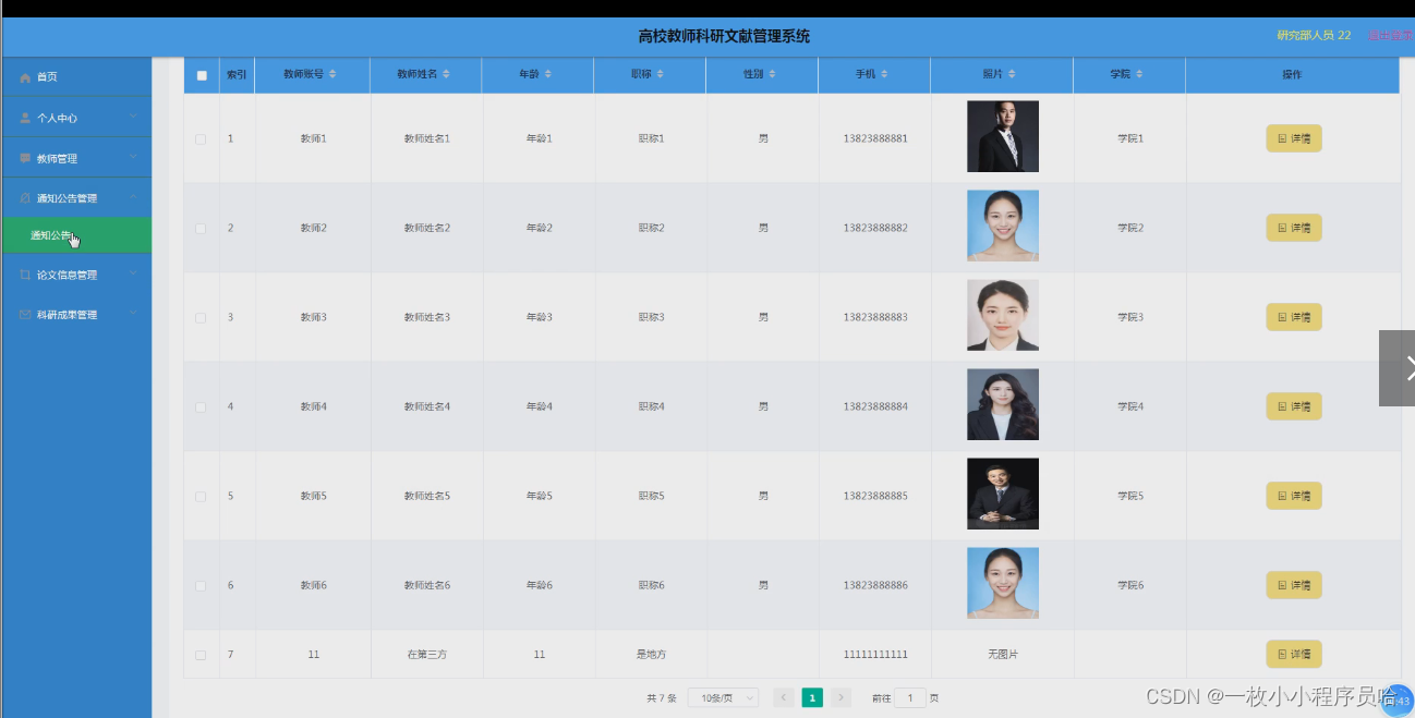 本文以Java为开发技术,实现了一个高校教师科研文献管理系统。高校教师科研文献管理系统的主要实现功能包括:管理员:首页、个人中心、学院信息管理、教师管理、研究部人员管理、通知公告管理、论文信息管理、科研成果管理,教师;首页、个人中心、学院信息管理、通知公告管理、论文信息管理,研究部人员;首页、个人中心、教师管理、通知公告管理、论文信息管理、科研成果管理功能,基本上实现了整个高校教师科研文献管理系统的过程。