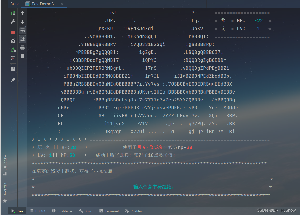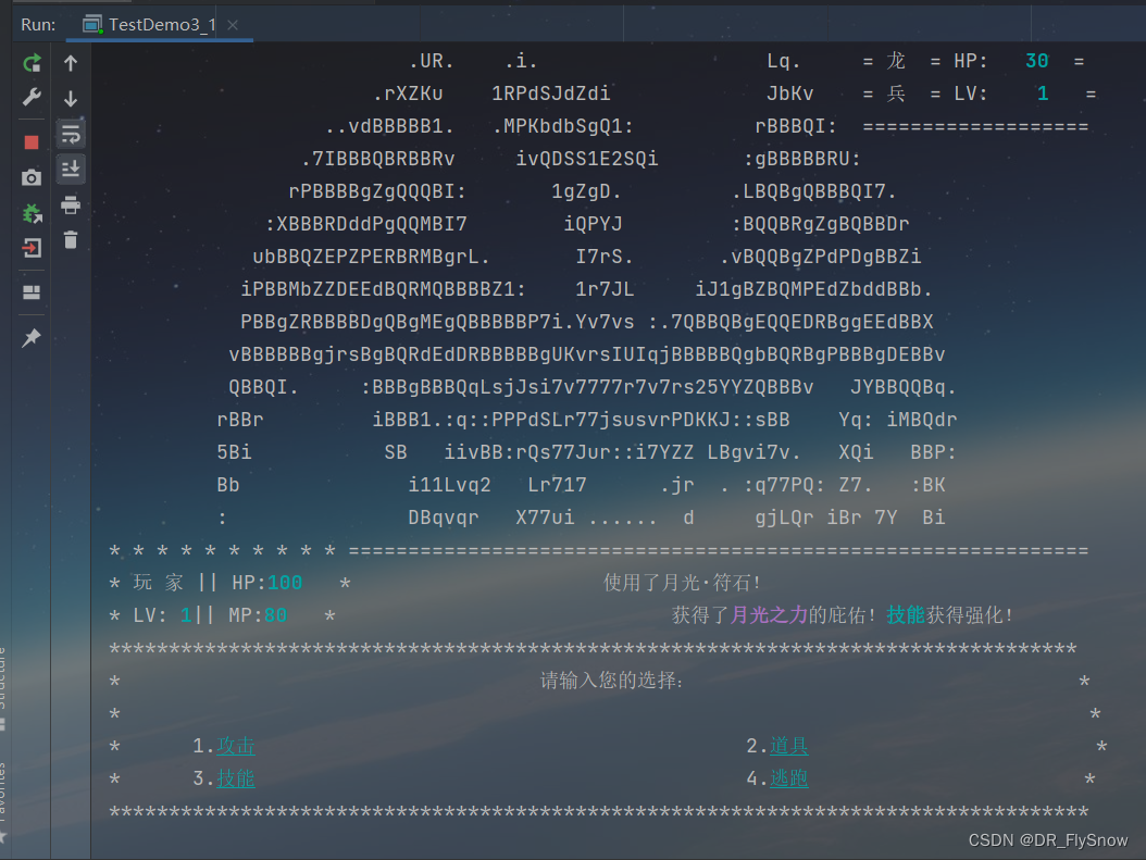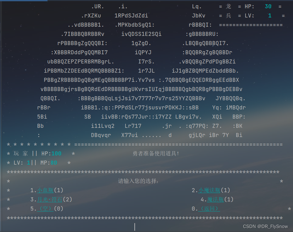 import java.util.Scanner;public class TestDemo3_1 {static Random r = new Random();static String[] bag = {"(空)", "小血瓶", "小魔法瓶", "月光·符石", "血瓶", "魔法瓶", "凤凰·符石", "???"};static String[] event = {"(空)", "[宝箱]", "废墟", "[遗落的木盒]", "遗落的钱袋", "神秘的山洞", "6", "7", "8", "9", "10", "幽暗的水晶", "祝福之泉", "映月之泉", "岩壁上的碑文", "15", "16", "17", "18", "19", "20", "先知", "商人", "23", "24", "25", "26", "27", "28", "29", "30", "龙兵", "龙卫", "龙王", "龙影", "若陀", "白灵龙", "龙卫首领", "小火龙", "火龙守卫", "喷火龙", "41", "42", "43", "44", "45", "46", "47", "48", "49", "50", "道路(下一层)", "普通的山洞"};static int[][] floorEvent = {{ 1, 2, 3, 4, 31,51}, { 2, 3, 32, 4, 11,51}, { 2, 3, 32, 4, 12,51}, { 2, 3, 32, 4, 21,51}, { 2, 3, 32, 4, 21,51},{ 2, 3, 32, 4, 21,51}, { 2, 3, 32, 4, 21,51}, { 2, 3, 32, 4, 21,51},{ 2, 3, 32, 4, 21,51}, { 2, 3, 32, 4, 21,51}};static int[] eventNum = {0, 1, 2, 3, 4, 5, 6, 7, 8, 9, 10, 11, 12, 13, 14, 15, 16, 17, 18, 19, 20, 21, 22, 23, 24, 25, 26, 27, 28, 29, 30, 31, 32, 33, 34, 35, 36, 37, 38, 39, 40, 41, 42, 43, 44, 45, 46, 47, 48, 49, 50, 51, 52};static int[] bagFull = {1, 2, 3, 0, 0, };static int[] bagNum = {1, 1, 1, 0, 0, };static int[] skillCost1 = {20, 15, 50, 5};static int[] skillCost2 = {25, 20, 45, 5};static int[] skillCost3 = {10, 15, 20, 5};static int[] playerHpMax = {100, 123, 146, 170, 205, 233, 257, 282, 323, 369};static int[] playerMpMax = {100, 110, 121, 132, 145, 161, 175, 184, 196, 200};static int[] playerHp = {100};static int[] playerMp = {100};static int playerLevel = 1;public static void createFloor(int[][] args, int floor) {//bag[]String[] ad = {"失落的飘渺之城", "地下城1层", "地下城2层", "地下城3层", "(4层)龙之城边缘", "(5层)龙距之城", "(6层)熔岩洞窟", "(7层)熔岩之下", "(8层)黑王宫入口", "(9层)黑王宫", "(?)真正的飘渺之城"};System.out.println(ad[floor]);for (int i = 0; i < args[floor].length; i++) {System.out.println((i + 1) + "." + event[args[floor][i]]);System.out.println();}if (floor > 0) System.out.println(0 + ".返回上一层");}public static void treasure(int a, int bag[], int num[], int floor, int p) {switch (a) {case 1: {int c = r.nextInt(2) + 4;putInBag(a, c, bag, num, floor, p);break;}case 2:case 3:case 4:case 15: {//怪物获取int c = r.nextInt(3);if (c == 0) {c = r.nextInt(3);} else {c = r.nextInt(2) + 4;}putInBag(a, c, bag, num, floor, p);break;}case 13:case 14:putInBag(a, a, bag, num, floor, p);}}public static void nothing() {System.out.println("nothing");}public static void putInBag(int a, int d, int bag1[], int number[], int floor, int p) {//摆放背包boolean flag = false;for (int i = 0; i < bagFull.length; i++) {if (bag1[i] == a) {number[i]++;if (a == 1) System.out.print("打开了" + event[a] + "!");else if (a >= 2 && a <= 5) System.out.print("在" + event[a] + "中翻找,");else if (a == 13) {System.out.print("沐浴着泉水的微光,仿佛有所感悟,");d = 3;} else if (a == 14) {System.out.print("检查了" + event[a] + "仿佛有所感悟,");d = 6;}System.out.println("获得了" + bag[d] + "!");if (a >= 1 && a <= 4) floorEvent[floor][p] = 0;//重置事件为空else if (a == 5) floorEvent[floor][p] = 15;else if (a == 13) floorEvent[floor][p] = 12;break;}if (i == bagFull.length - 1) flag = true;}if (flag) {for (int i = 0; i < bagFull.length; i++) {if (bag1[i] == 0) {if (a == 1) System.out.print("打开了" + event[a] + "!");else if (a >= 2 && a <= 5) System.out.print("在" + event[a] + "中翻找,");else if (a == 13) {System.out.print("沐浴着泉水的微光,仿佛有所感悟,");d = 3;} else if (a == 14) {System.out.print("检查了" + event[a] + "仿佛有所感悟,");d = 6;}System.out.println("获得了" + bag[d] + "!");bag1[i] = d;number[i]++;if (a >= 1 && a <= 4) floorEvent[floor][p] = 0;//重置事件为空else if (a == 5) floorEvent[floor][p] = 15;else if (a == 13) floorEvent[floor][p] = 12;break;}if (i == bagFull.length - 1 || bag1[i] == a && bagNum[i] == 9) {System.out.print("打开了" + event[a] + "!");System.out.println("但是背包满了,放不下了~");}}}}public static void chooseStart() {{System.out.println(" ");System.out.println(" ir :: ii : i . ");System.out.println(" jS rJL .B. B2 Br s77rri:irrrrrr7 Bi B:1B");System.out.println(" :..DB. iI... .BL25KXKSX5KS .Q :B M: IIUULKB5j55SSqs Ii ... .B7 J.");System.out.println(" 75JvvBBrBBi1USi YB ........: .B. B XE7ZB :B :YB BU2vBQYvSL ");System.out.println(" S: J: : Bi :sBBr:BqLB1 B Bqi .RB.:B X ");System.out.println(" Kv sj Br 22UII5I21B .u :B: vr .Q .B QB: g Quu: 2 :J ");System.out.println(" KY iv.B. vS B vr 7U.gr qY :BP K E 1 gr7: ");System.out.println(" Bi .BB iiYUu212uUr B Ji r1 iM:::. B . .5B:Y r Bs. ");System.out.println(" :B 1B1. :B Mi :Dgi.B . B. rD rr.:Mviu:D.:: ");System.out.println(" .Q. rYuYB. .uv7B: . 7L::iJv . Q. 7r i2:iBi: ");System.out.println(" ***************************** . ");System.out.println(" * =请输入对应指令= * ");System.out.println(" * 1. *" + "\33[36;50;4m" + "开始游戏" + "\33[0m" + "* * ");System.out.println(" :* * ");System.out.println(" .iY5* 2. *" + "\33[36;50;4m" + "继续游戏" + "\33[0m" + "* * ");System.out.println(" :LdbP* * ");System.out.println(" isPqKP* 3. *" + "\33[36;50;4m" + "设置" + "\33[0m" + "* * ");System.out.println(" .rIPIIJP* * ");System.out.println(" .7SgXS2S2* 4. *" + "\33[36;50;4m" + "帮助" + "\33[0m" + "* * ");System.out.println(" .ivPXK57* * ");System.out.println(" :r72K* 0. *" + "\33[36;50;4m" + "退出" + "\33[0m" + "* * ");System.out.println(" ..:***************************** ");System.out.println(" .... ");}//标题界面}public static void chooseWarning() {{System.out.println(" ");System.out.println(" ir :: ii : i . ");System.out.println(" jS rJL .B. B2 Br s77rri:irrrrrr7 Bi B:1B");System.out.println(" :..DB. iI... .BL25KXKSX5KS .Q :B M: IIUULKB5j55SSqs Ii ... .B7 J.");System.out.pri