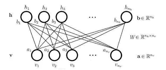 Bernoulli RBM是一种图论模型,如下图所示,具有两层结构,可见层v和隐藏层h,可见层与隐藏层之间有权重参数W和两个偏执a,b。注意它们是公用W,但是不共用偏执。