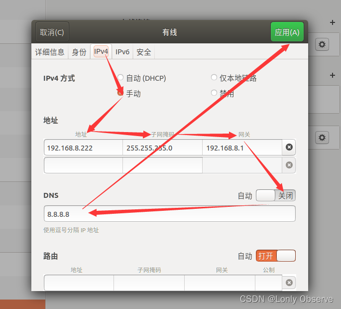 第一步: 第二步: 注意:如果自动不行就使用所用网络的网卡具体操作如下 第三步: 第四步:地址和网关在主机终端中使用命令 ipcofig 获取 第五步:配置有线网络,地址要与主机地址在同一网段,但不能相同 第六步:在虚拟机终端测试网络连接