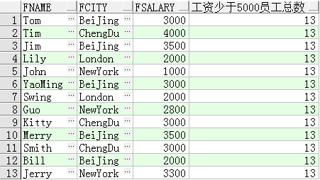 select fname,fcity,fsalary,(select count(*) from t_person where fsalary < 5000) 工资少于5000员工总数from t_personwhere fsalary < 5000