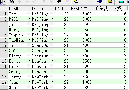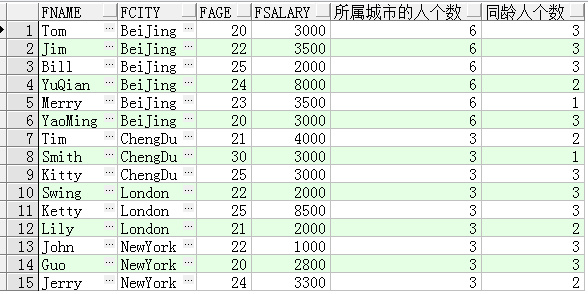select fname,fcity,fage,fsalary,count(*) over(partition by fcity) 所在城市人数 from t_person