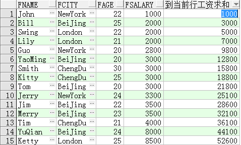 select fname,fcity,fage,fsalary,sum(fsalary) over(order by fsalary) 到当前行工资求和from t_person