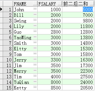 SELECT FName,FSalary,SUM(FSalary) OVER(ORDER BY FSalary ROWS BETWEEN 2 PRECEDING AND 2 FOLLOWING) 前二后二和FROM T_Person;