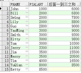 select fname,fcity,fage,fsalary,sum(fsalary) over(order by fsalary range between unbounded preceding and current row) 到当前行工资求和from t_person
