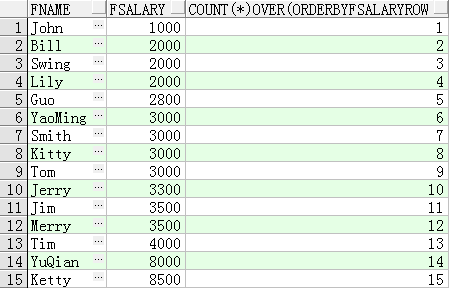 这里的开窗函数“COUNT(*) OVER(ORDER BY FSalary RANGE BETWEEN UNBOUNDED