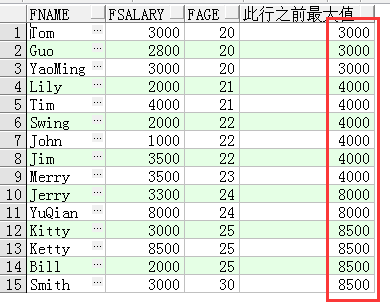 MAX(FSalary) OVER(ORDER BY FAge) 此行之前最大值