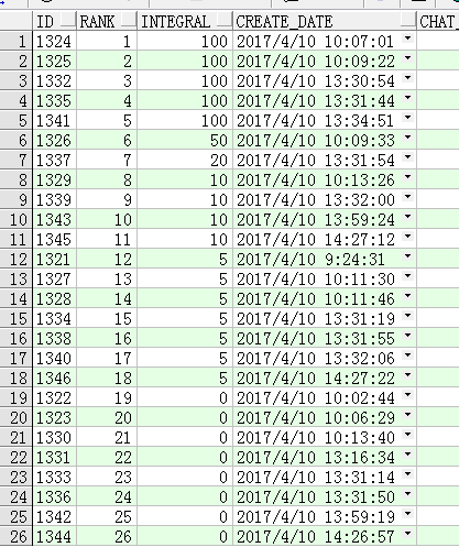 select t.id,t.integral,t.cell,t.create_date,row_number() over(order by t.integral desc, t.create_date asc) rankNumfrom t_zhcw_order twhere t.issue = 20170331