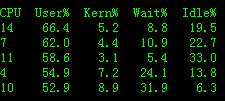 Wait%:CPU处于等待状态占CPU时间的比率。CPU的等待一般都为等待IO的响应,如果这个值长时间很高时,就说明IO来不及响应很多的IO请求,这个时候,就只能从IO层面想办法优化了。